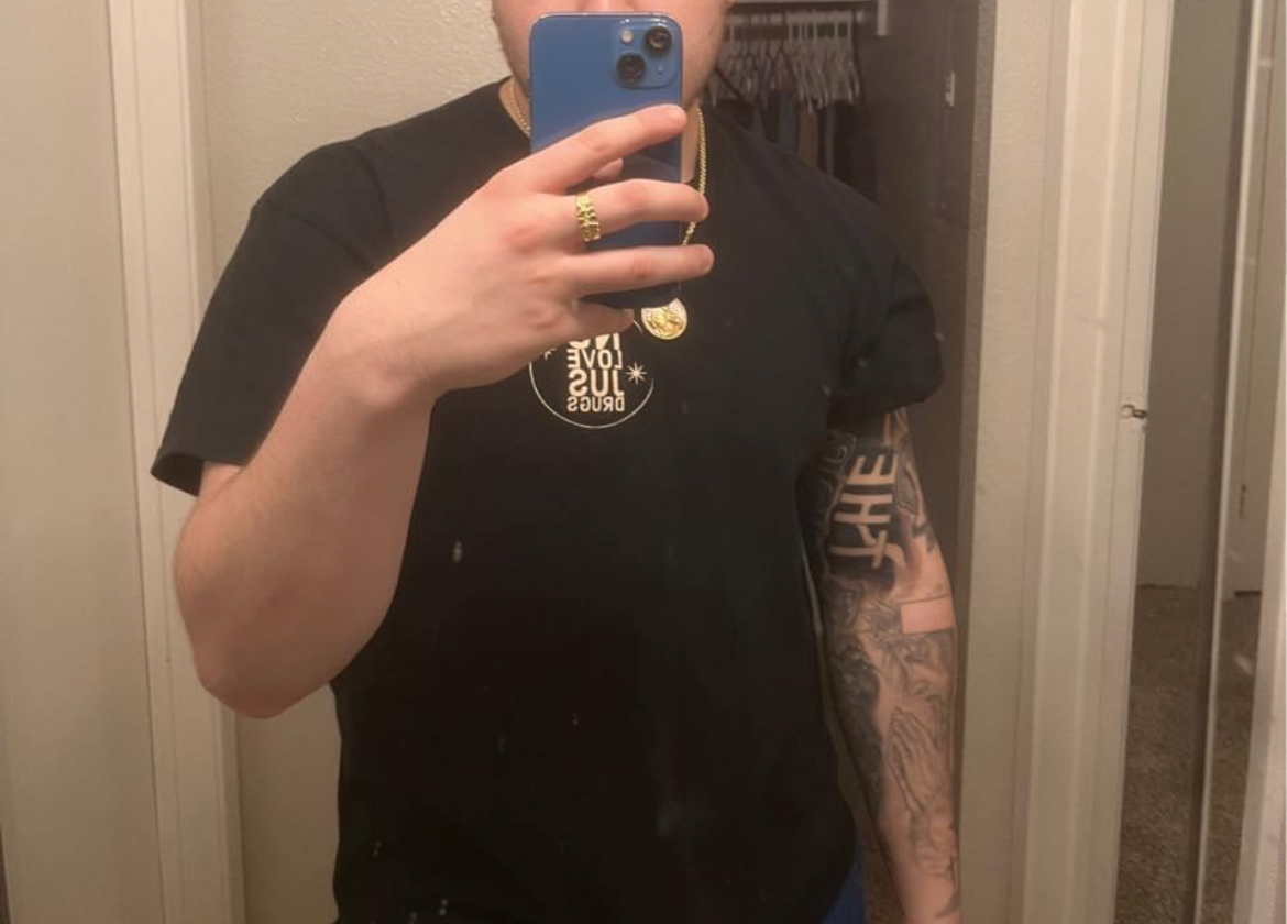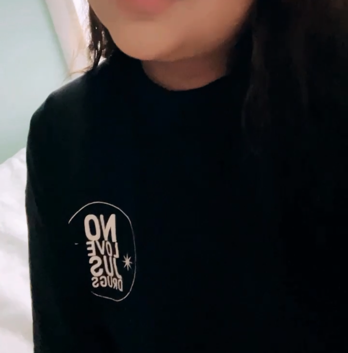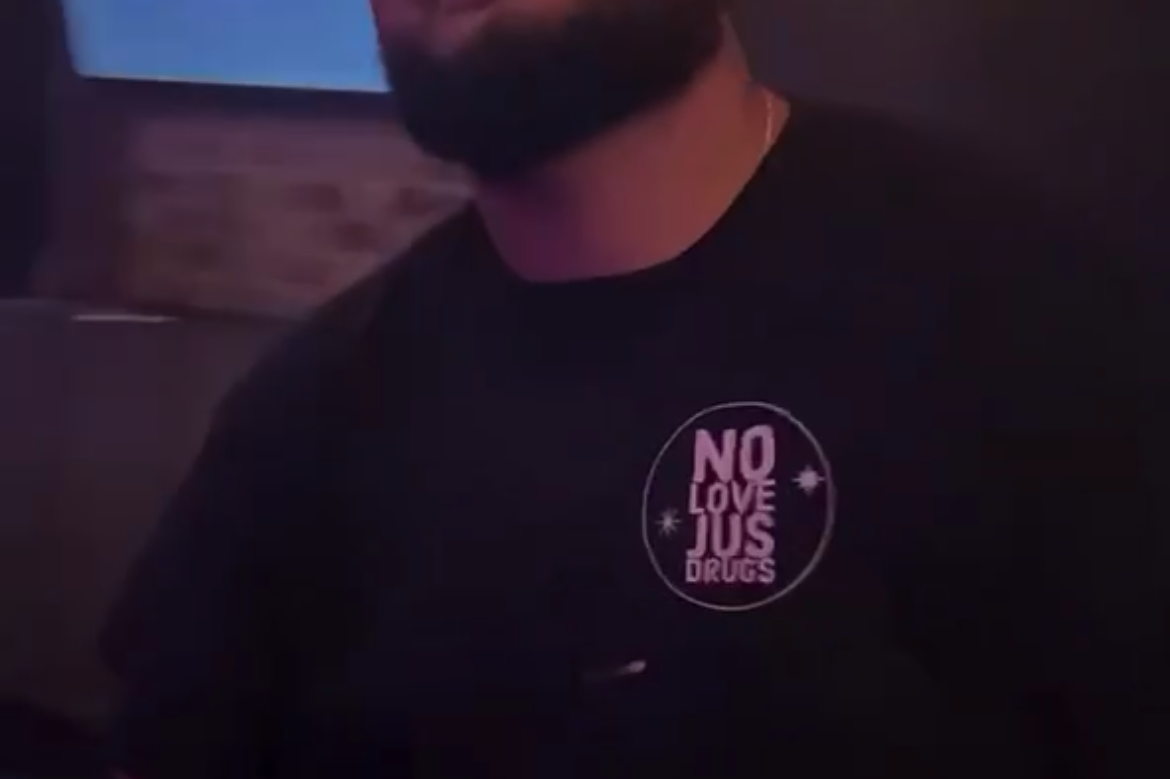 - Front Design: “No Love Jus Drugs” circular chest print