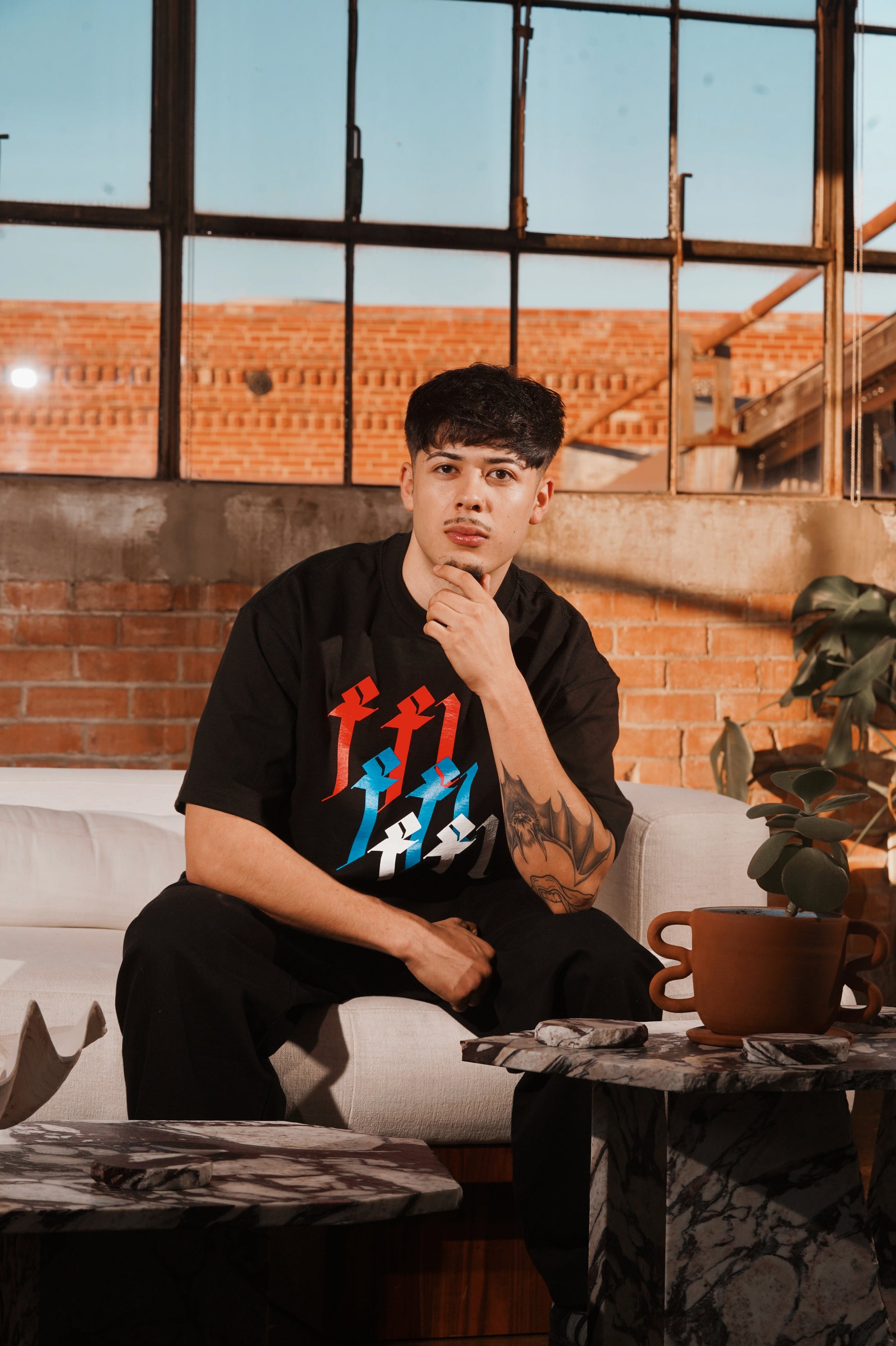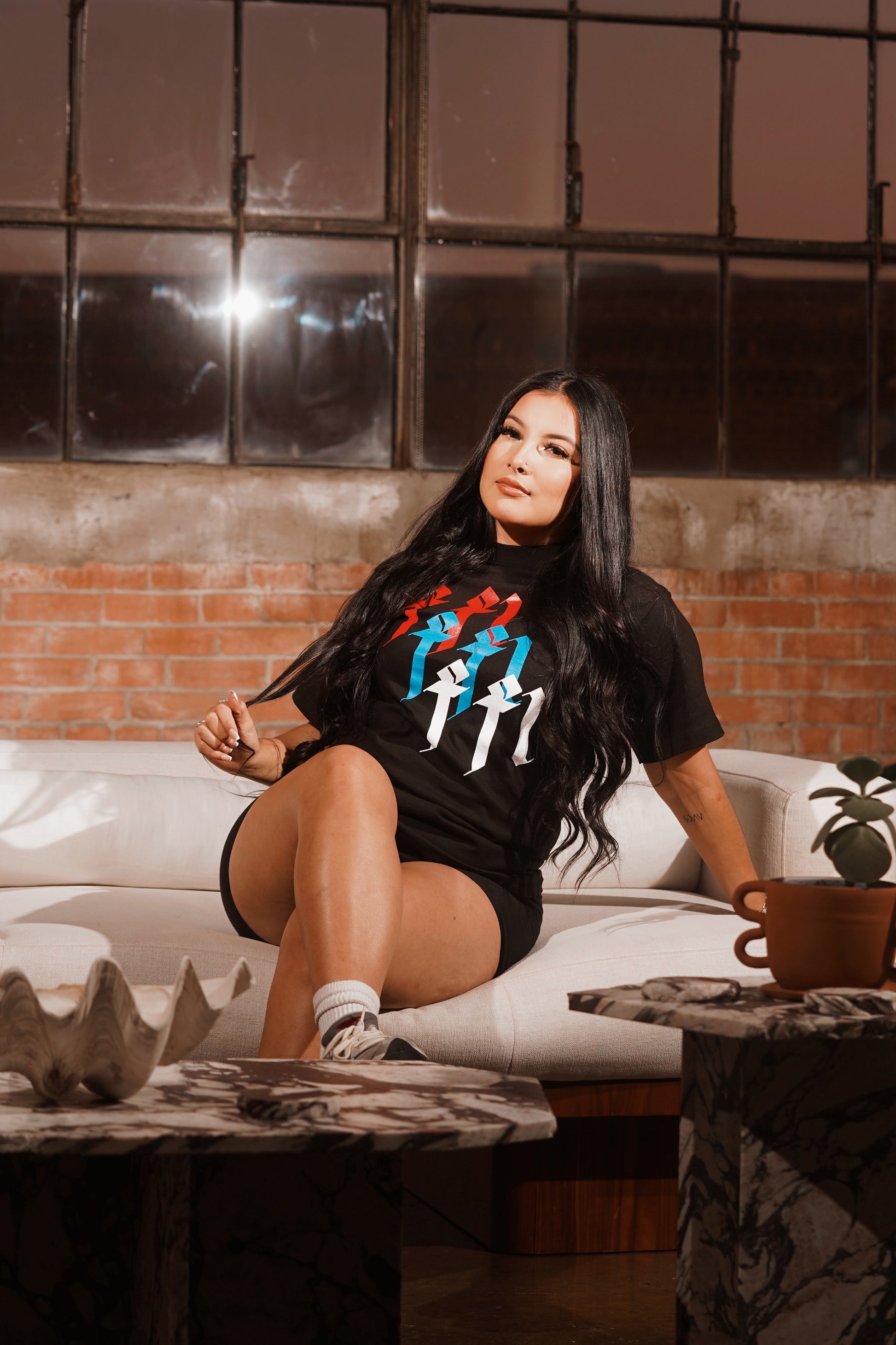 Comfortable heavyweight tee , with long shoulder sleeves, heavy cotton. Brand design in the center in white,blue, & red. Unisex tee and various sizes.